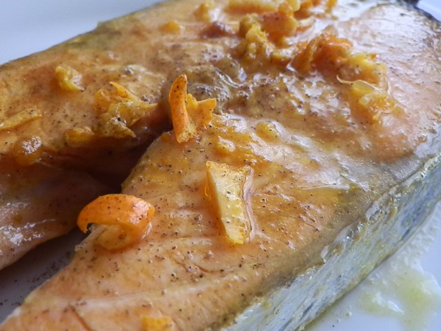 (io non uso il sale, per cui chi vuole lo aggiunga alla fine con il pepe. ma il salmone ha una carne saporitissima di per sé…)